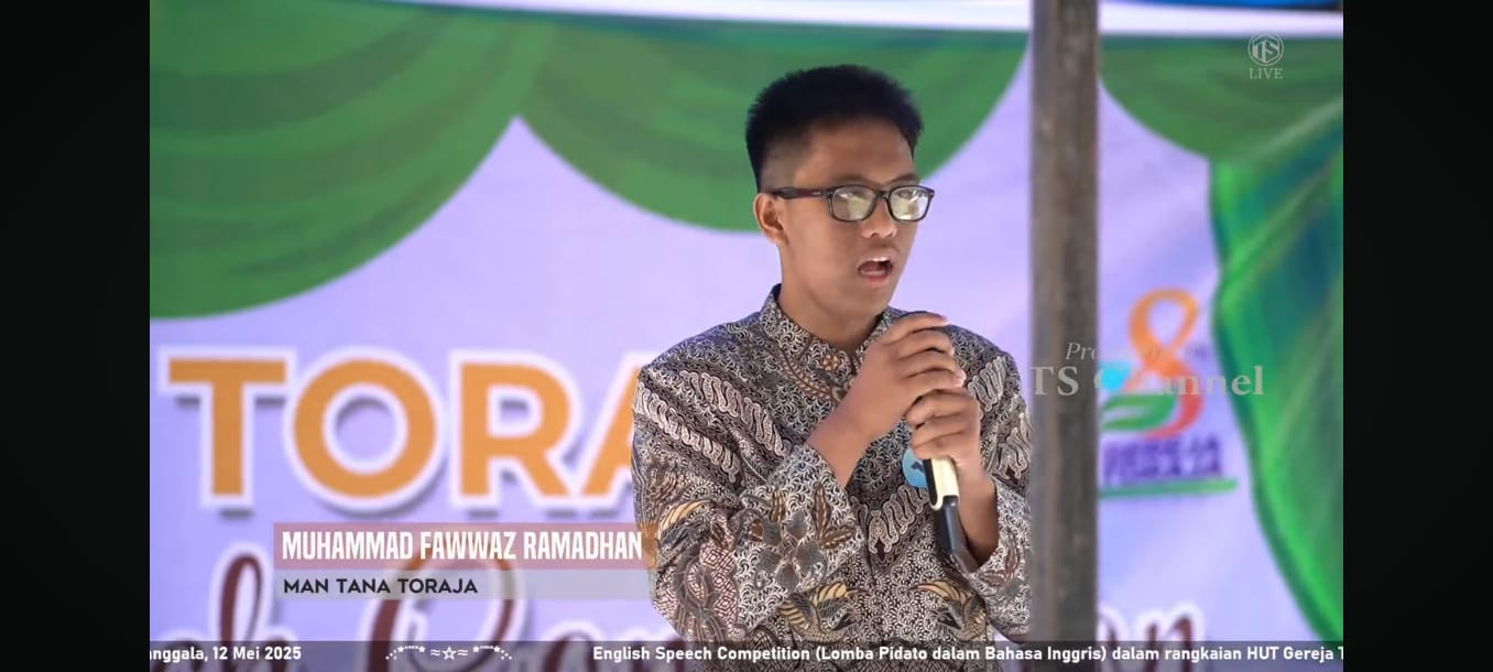 Toraja Utara, 12 Mei 2025 — Muhammad Fawwaz Ramadhan, siswa MAN Tana Toraja, berhasil mengukir prestasi gemilang dengan meraih Juara 1 dalam ajang English Speech Competition 2025 yang digelar dalam rangka HUT ke-78 Gereja Toraja. Kompetisi ini berlangsung di Tongkonan To’liku, Tandung Nanggala, Kabupaten Toraja Utara, pada Senin (12/5).