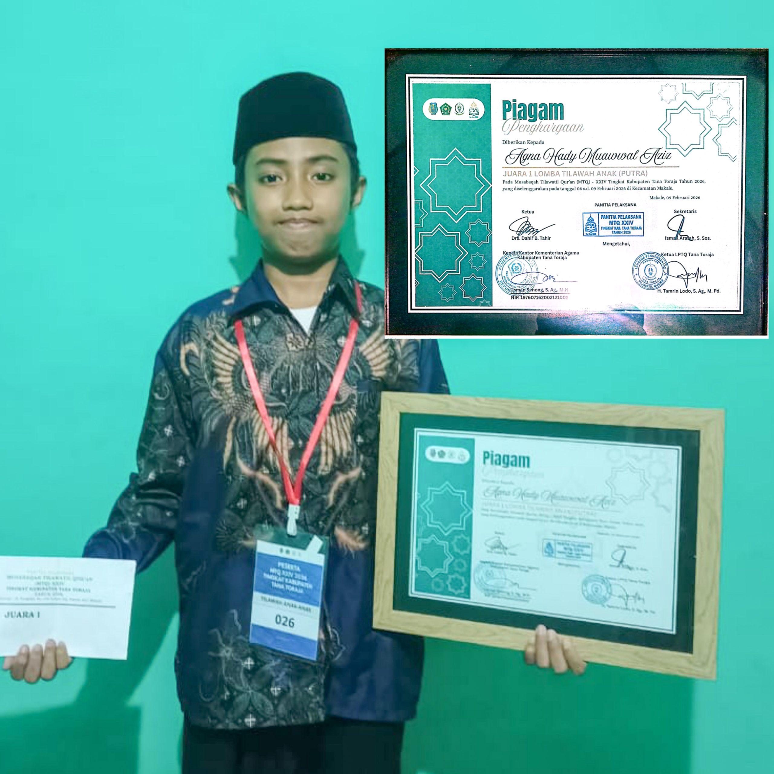 (Makale, Humas MTsN 1)__Prestasi membanggakan kembali ditorehkan oleh peserta didik MTsN 1 Tana Toraja. Agna Hady Muawwal Aziz berhasil meraih Juara 1 Lomba Tilawah Anak (Putra) pada ajang Musabaqah Tilawatil Qur’an (MTQ) XXIV Tingkat Kabupaten Tana Toraja Tahun 2026 yang diselenggarakan pada 6–9 Februari 2026 di Kecamatan Makale. Piagam penghargaan diserahkan secara resmi pada Senin, 9 Februari 2026 saat acara penutupan MTQ.